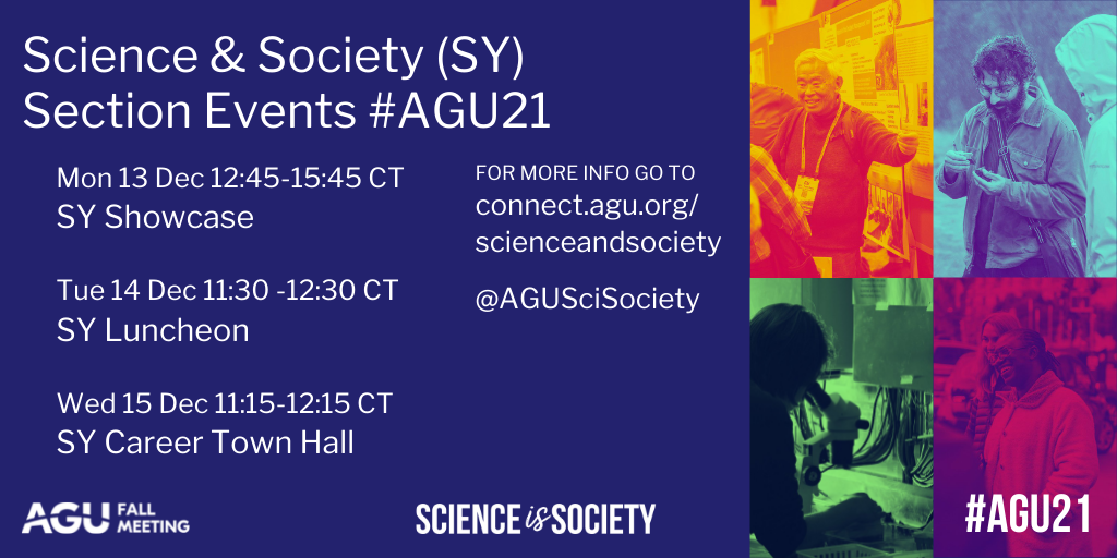 SY Showcase, Monday, 13 December from 12:45-15:45 CT (parts 1 & 2), Convention Center D-2 & online everywhere. Because of COVID-19 safety protocols, we could not host our SY Luncheon in a room with online access. Instead, we’ve innovated. We will be sharing a year-in-review and future SY updates as part of the SY Showcase. The Showcase will also feature several engaging panel discussions that highlight SY Scholarship, a SY World Tour, SY in NOLA, and Looking Forward with AGU President Susan Lozier. It should be fun and informative, join us!