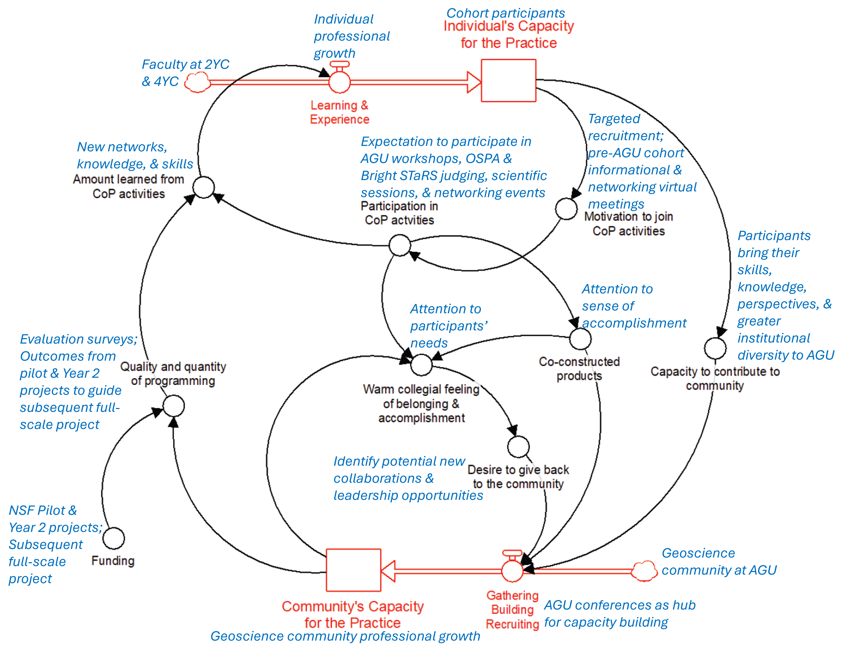 Figure Caption: An annotated conceptual model of community of practice system dynamics that build individual and community capacities through reinforcing feedback loops. Modified from Kastens and Manduca (2018). Annotations in blue text are proposed project elements (e.g., activities and characteristics) situated in the theoretical context.