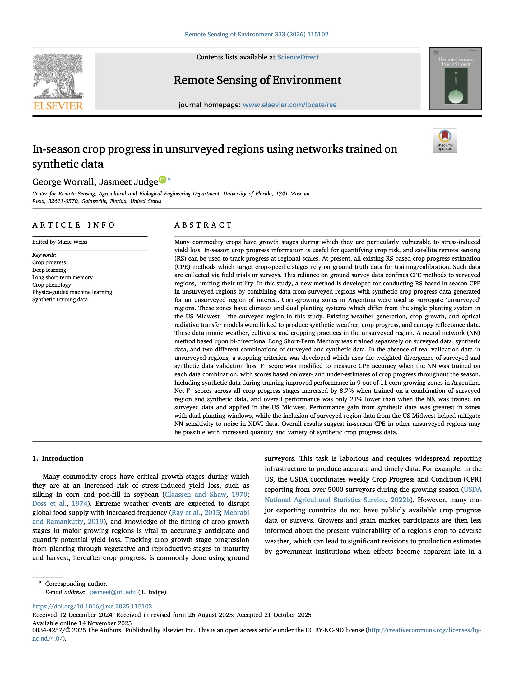 Worrall and Judge (2026) address this problem by developing a framework that combines satellite observations with synthetic crop progress data to enable in-season monitoring in unsurveyed regions. The study links weather generators, crop growth models (DSSAT), and radiative transfer models to simulate realistic crop development and associated reflectance signals. A bi-directional LSTM neural network is then trained using combinations of real survey data from the U.S. Midwest and synthetic data generated for Argentina, which serves as a proxy “unsurveyed” region.