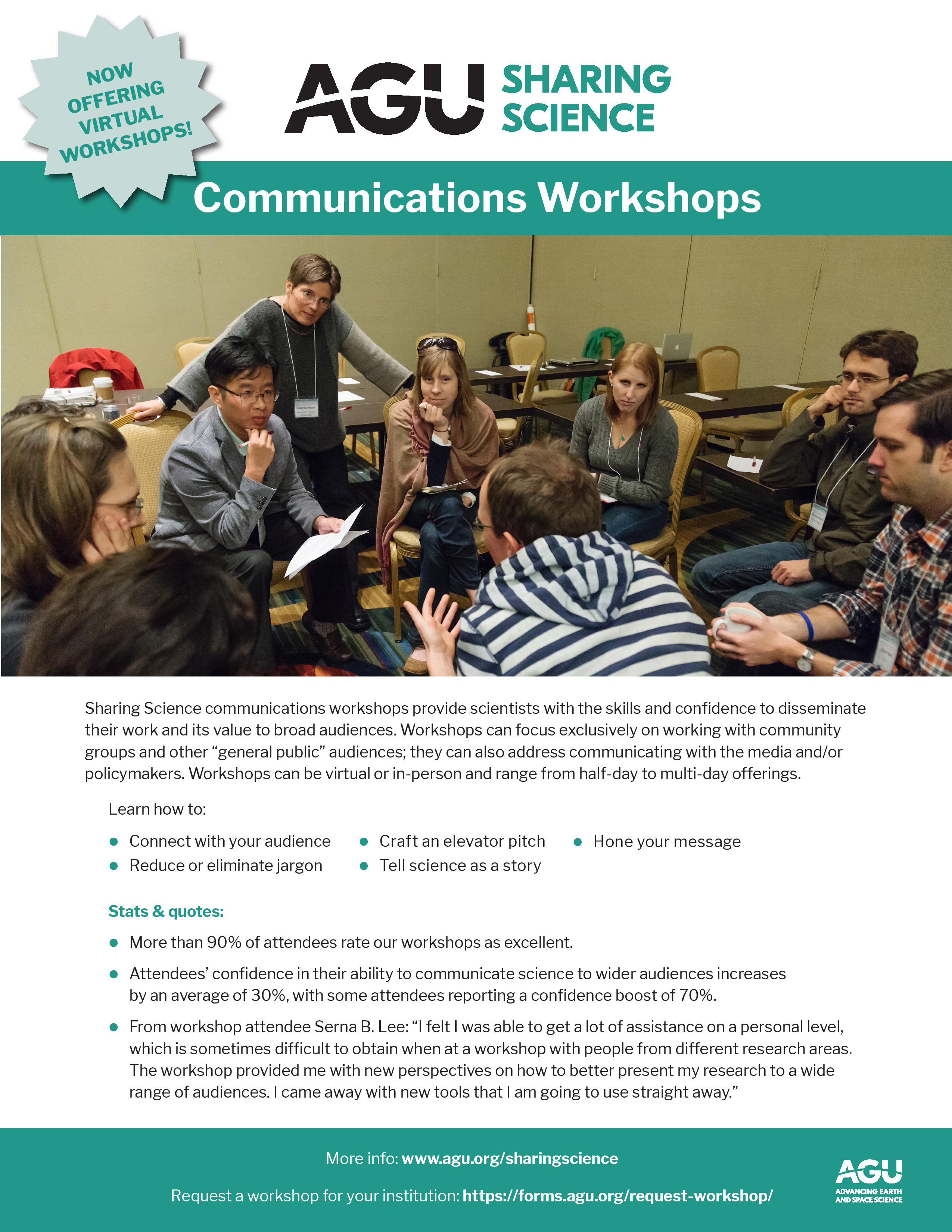 The ability to communicate science not only to peers, but also to non-science audiences, is a critical skill for both science dissemination and career development. AGU's Sharing Science program runs virtual workshops that provide scientists the skills, tools, and resources to communicate their science effectively, and attractively, to broad audiences.